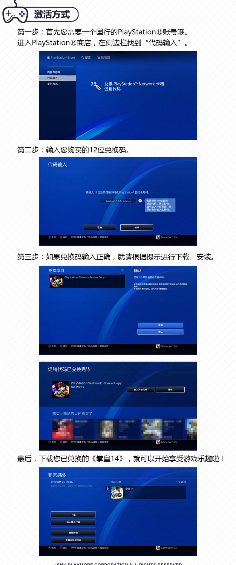 | 使用说明:登陆您的国行PlayStation账号,进入商店左侧输入激活码,激活游戏后下载安装游戏即可! | |